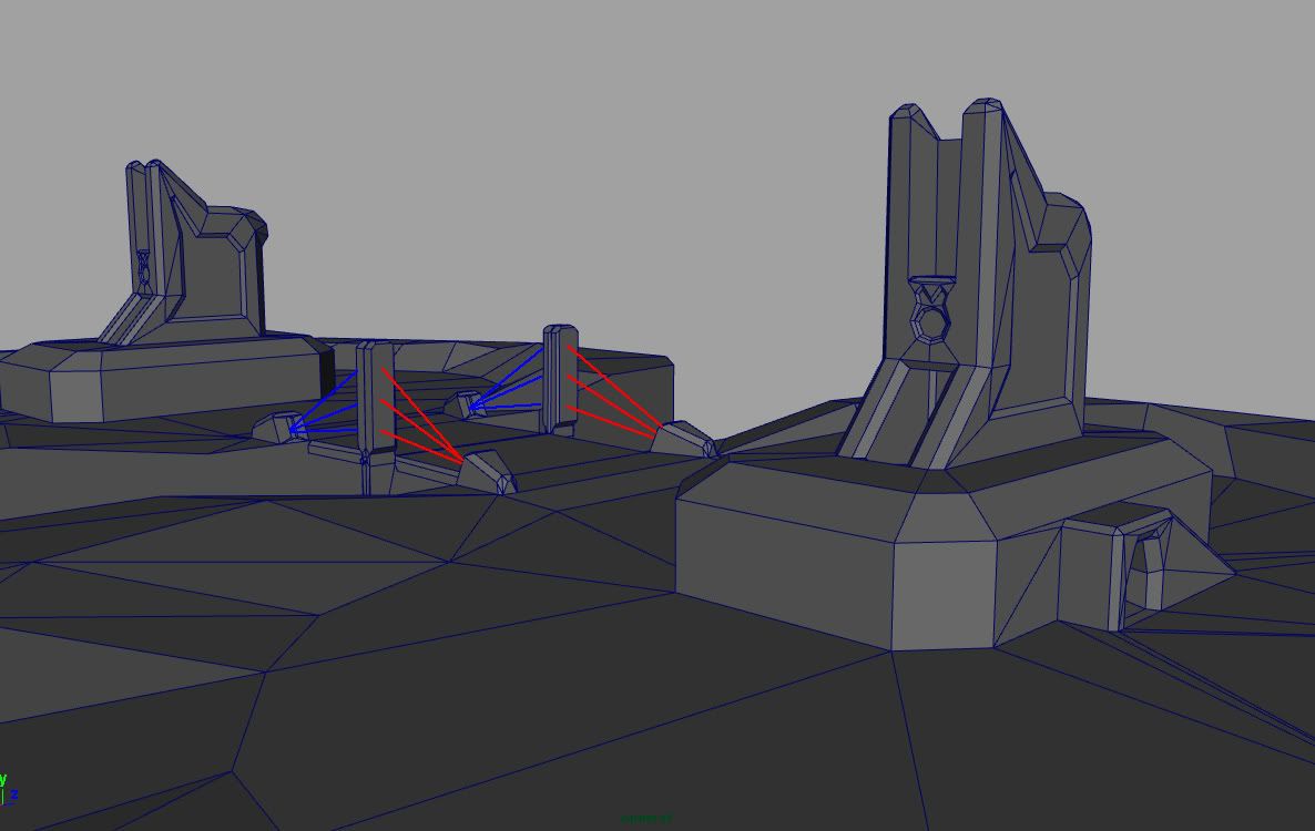 Basically someone inside pushes a button to create an energy node, and they charge it up by jumping into the beam. Their shields drop and they float up between the protrusions on the roof. Sniper bait, but if they charge the energy node (by floating above the towers on the roof with zero sheilds and zero cover)... their flag room gets sealed off so no-one can leave it. (Hence the roof formation... trying to make sort of a symbolic alter for the dude who risks his nuts to charge the flag-room shield)