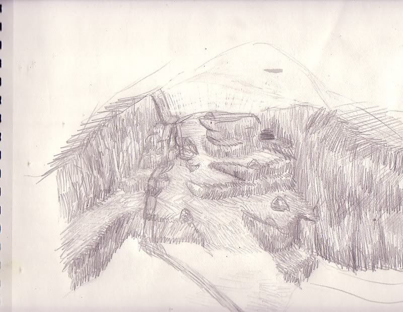 looks pretty sick but make the stream a bit more winding, maybe have a random small pond it feeds into then keeps going. also where the bottom of the drawing is you should put the base but it should be like on a cliff edge. make things more interesting.