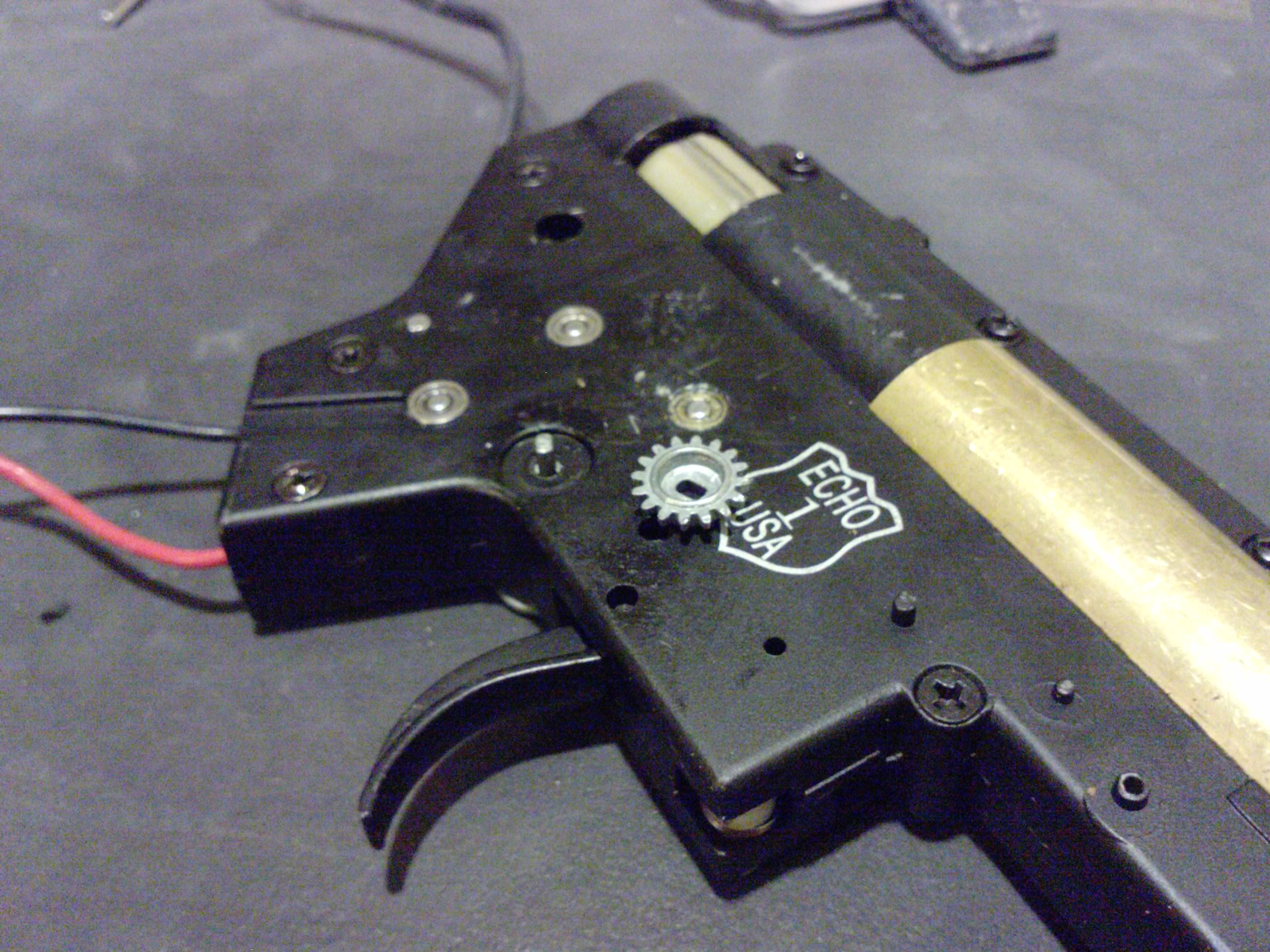 Opened up my gear box but found nothing broken. There was a broken screw on the trigger assembly, but that was locked in its socket. I checked the pinion gear on the motor too, and found it to be loose. Even tightening that, the gun still shows the same symptoms when fired. I'm going to order a new set of bushings, a new o-ring for the piston, and a new pinion gear for the motor since I said that it already had wear on it. I'm hoping that a cleaning of the gearbox, and a new shim job will fix the problem. The motor seems to be spinning fine when we isolated it from the gear box. The gears themselves seem to be stuck, but have no damage to them. Also, I really don't like how the tappet plate reaches over the sector gear(the gear to the top right). But I think that's how all gear boxes are.