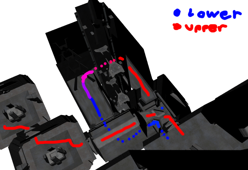 Players can go up the ramp and wrap around the 'plasma tower crap thing' to get to the upper level. Enterint the upper level can either have you drop down to the lower (for avoidance of people chasing or to sneak up on people, whatever), or continue to the left to enter the secondary path into the bases. Glass is breakable so you can shoot through the central plasma chamber, and also through the glass in the upper level's lookout, so you can jump on people and get them, or just quickly drop down and shit