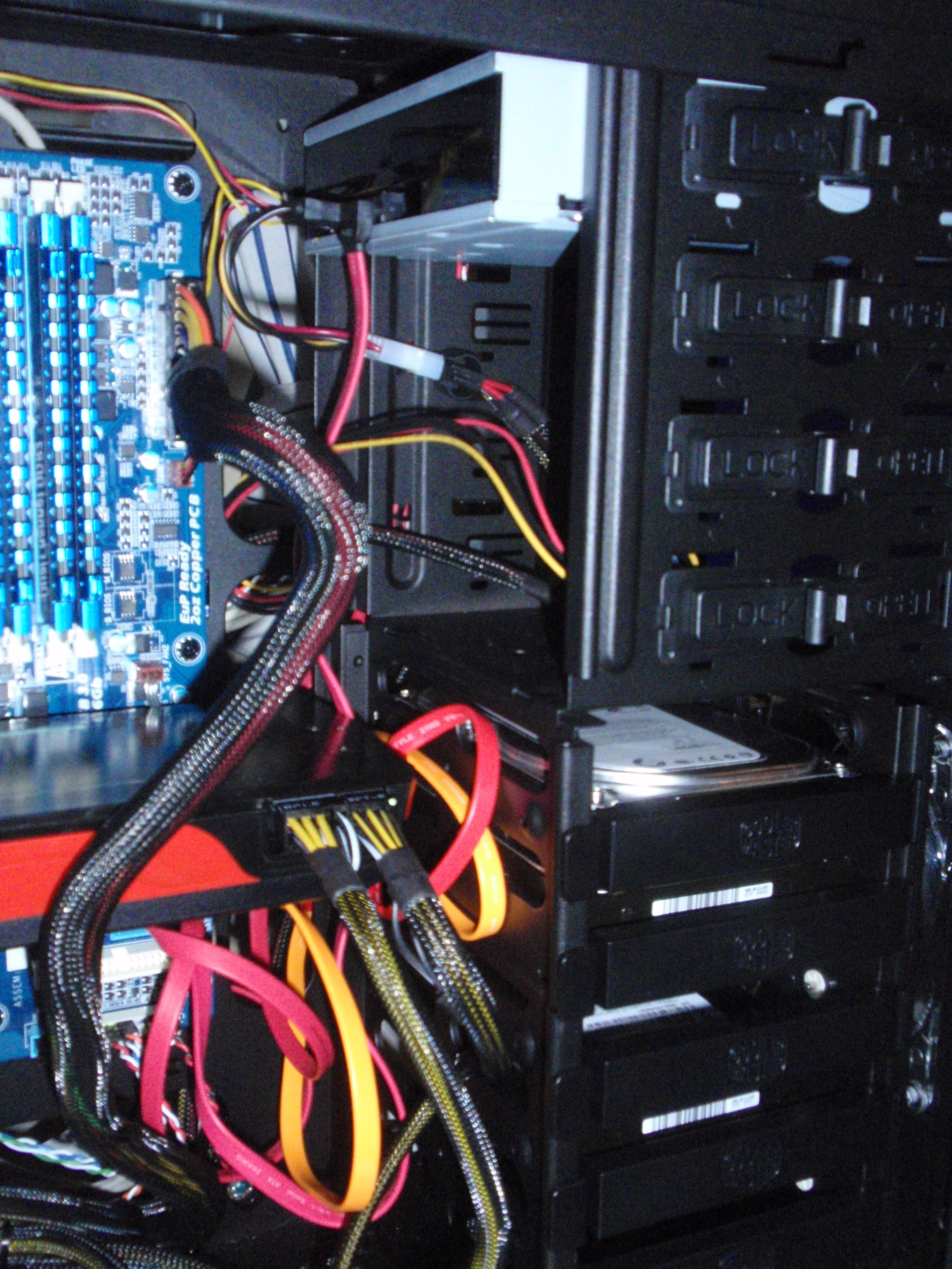 As for my cable "management": it was shoot from the hip. It was my first time building a machine from the ground up. Also, there are two or three thick ass power cords coming out of the PSU which I can't remove and have no use for ATM adding to the clutter. Also also, GFX card takes up the entire free length of the case's guts save for about 1/2" so wiring transversal isn't so direct.