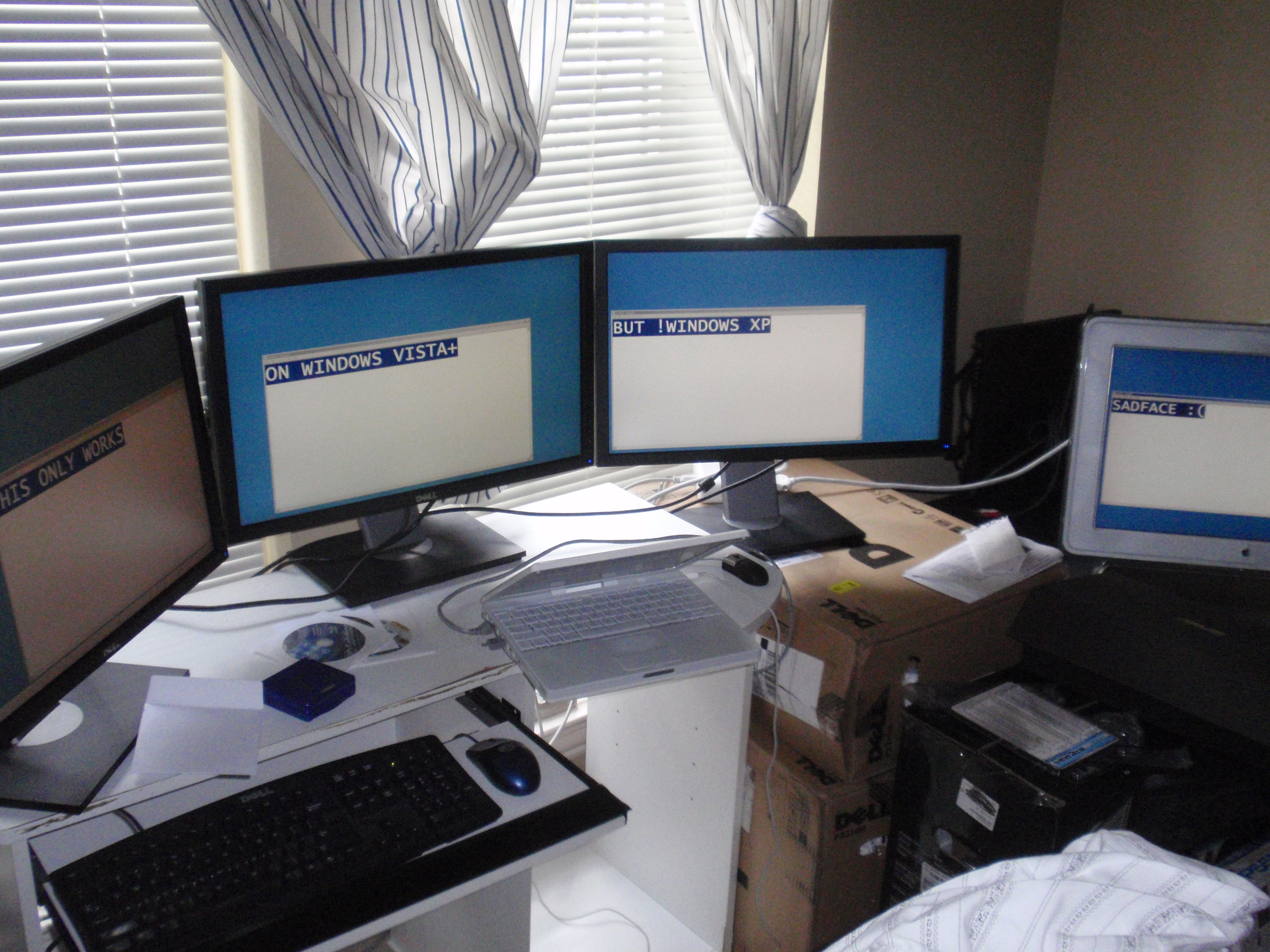 If I do, they'll have to be displayport monitors because I don't want to buy a fucking active-converter T_T. That GFX card has 6 MiniDP ports, and lets you use 2 of those ports with passively adapted monitor connections (ie, MiniDP-2-DVI cable). After that, you have to actually buy a $150+ box which needs it's own power supply to actually convert the DP signal to DVI, VGA, etc.